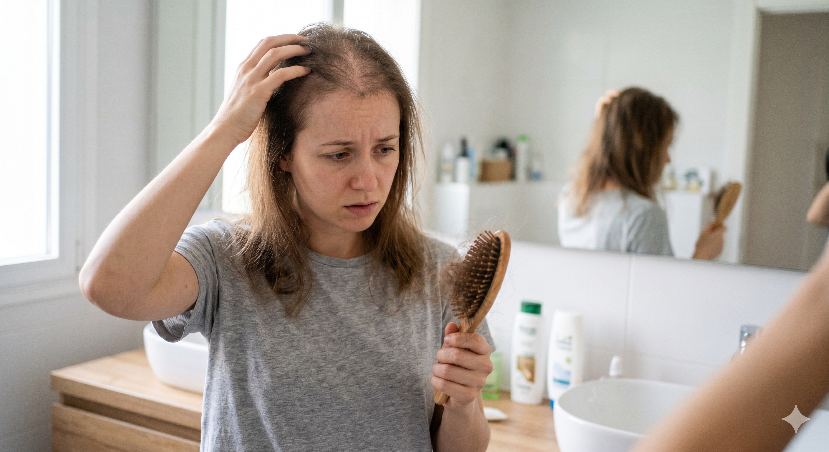 La forma más común de pérdida de cabello, tanto en hombres como en mujeres, asociada a factores genéticos y hormonales.