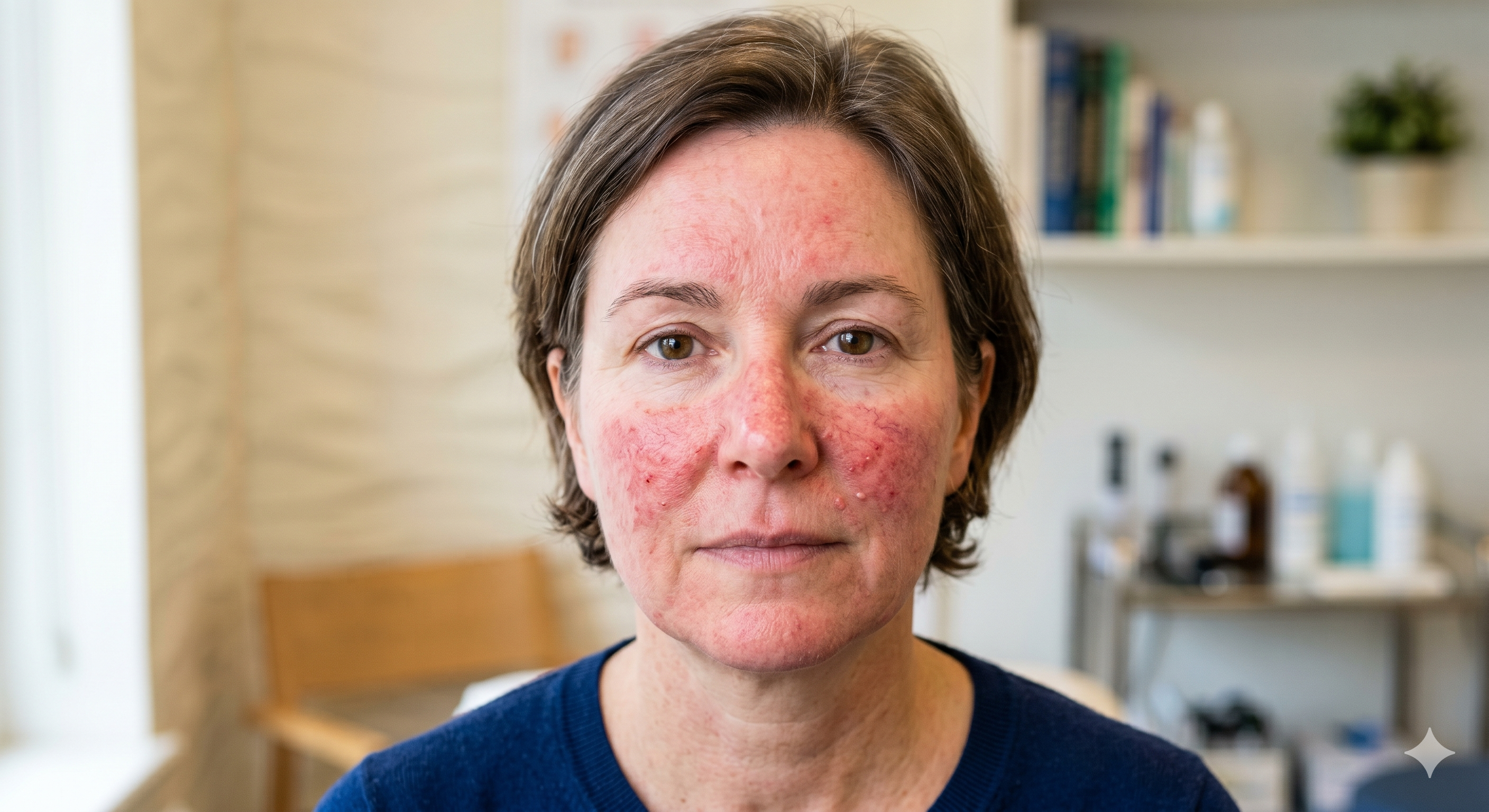Afección cutánea frecuente que provoca enrojecimiento persistente y vasos sanguíneos visibles en la cara. También puede producir pequeñas protuberancias con pus.