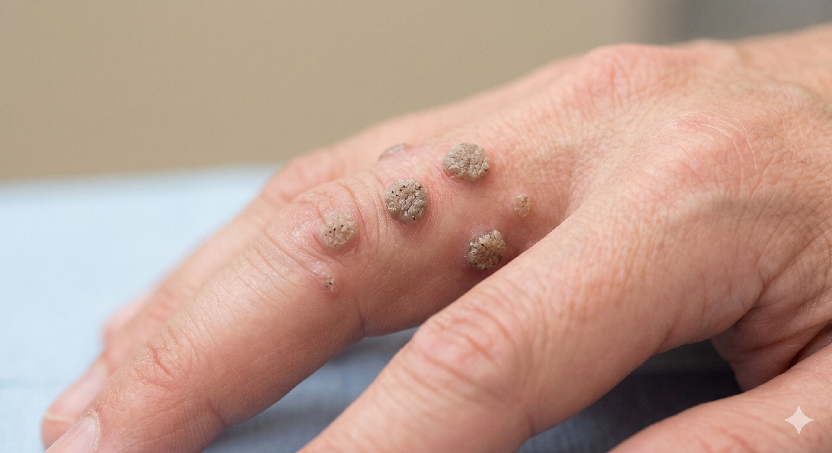 Pequeños bultos granulares en la piel causados por el virus del papiloma humano (VPH). No representan un riesgo grave pero son contagiosas.
